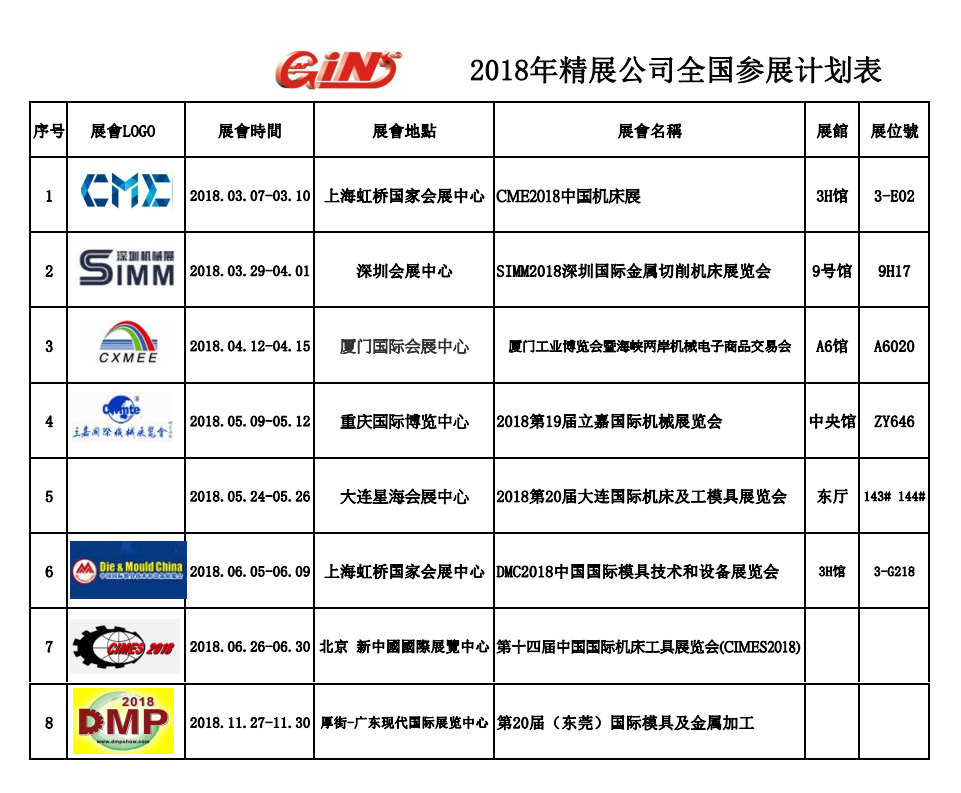 2018年精展公司全國參展明細(xì)